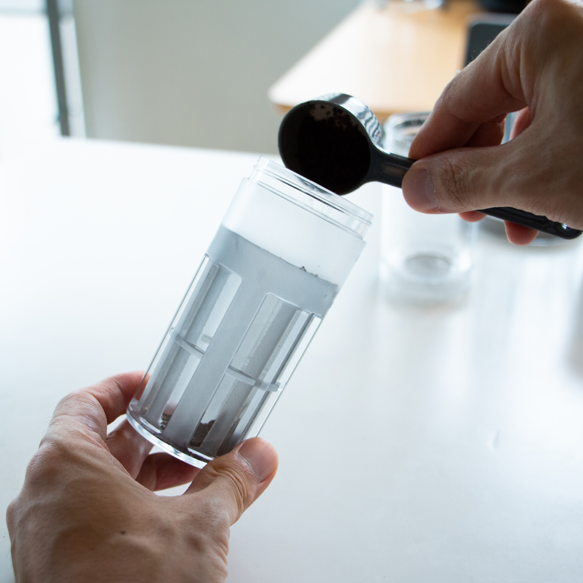 水をボトルに入れます。分量もアレンジ出来ますが、コーヒー粉20gに対して水240mlがおすすめ。