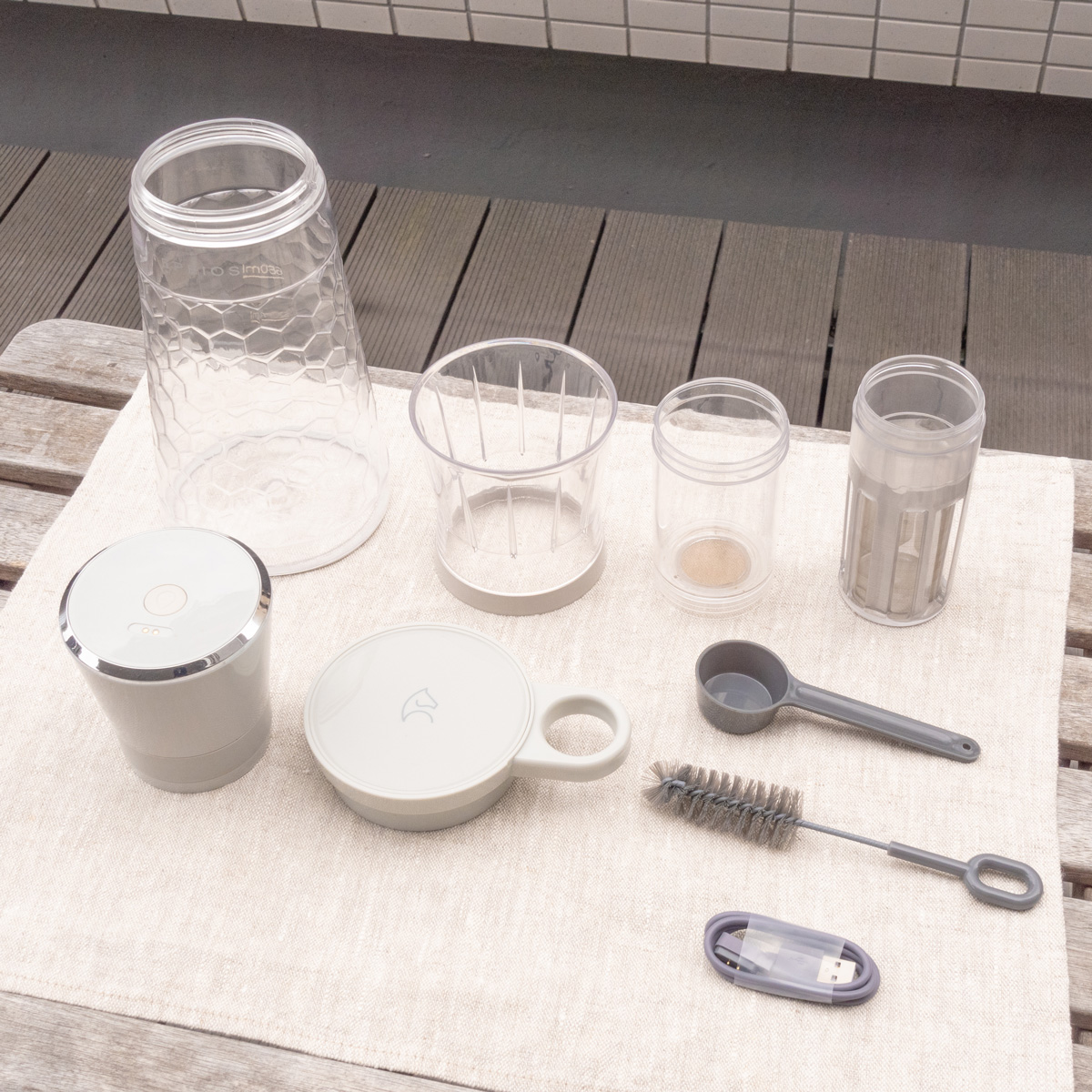 カップ上・カップ下、メインユニット、スプーン、充電用ケーブル、ストレーナー、フィルター、携帯用フタ
