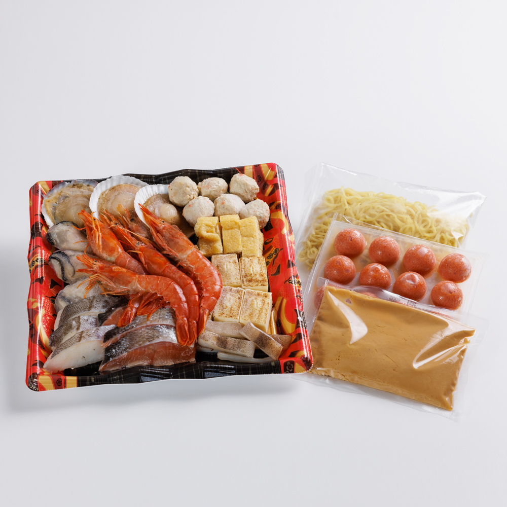 内容量:ラーメン200g、牡蠣3個、ほたて貝3枚、いか6切、赤エビ6尾、秋鮭20g×3切、辛子明太子10g×12、助宗鱈20g×3切、かにつみれ6個、油揚げ6個、焼豆腐6個、ごま寄せ鍋たれ200g