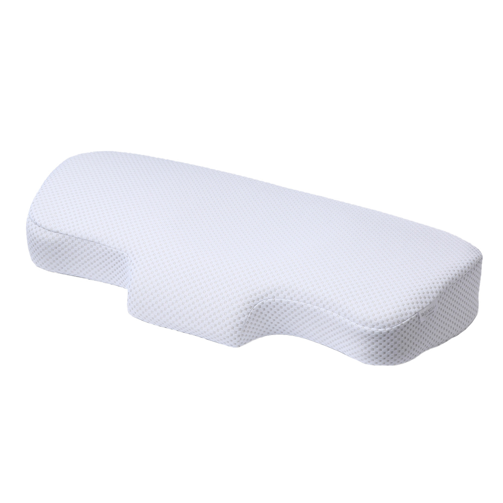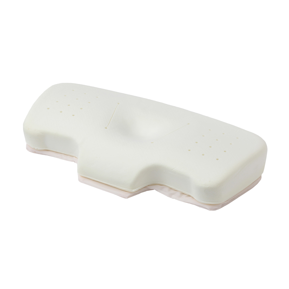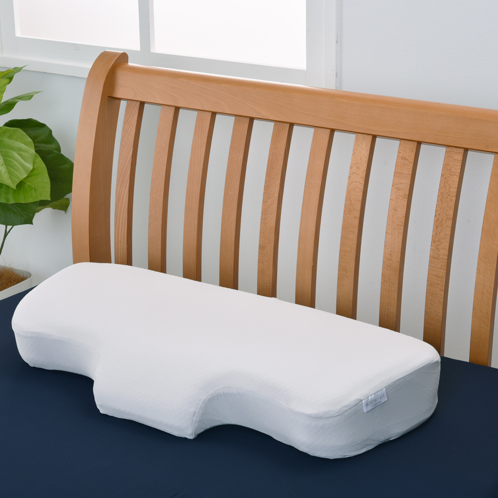 頭は中央でやさしく沈み、両サイドは少し高めに。横向きでも仰向けでも、首・肩が自然な位置に収まり、寝返りしてもズレにくい安定設計です。