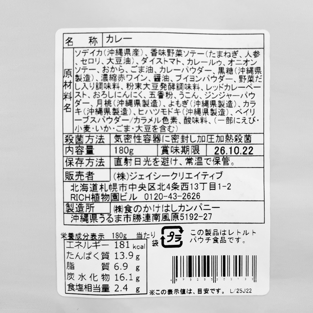 原材料名:ソデイカ(沖縄県産)、香味野菜ソテー(たまねぎ、人参、セロリ、大豆油)、ダイストマト、カレールウ、オニオンソテー、おから、ごま油、カレーパウダー、黒糖(沖縄県製造)、濃縮赤ワイン、醤油、ブイヨンパウダー、野菜だし入り調味料、粉末大豆発酵調味料、レッドカレーペースト、おろしにんにく、五香粉、うこん、ジンジャーパウダー、月桃(沖縄県製造)、よもぎ(沖縄県製造)、カラキ(沖縄県製造)、ヒハツモドキ(沖縄県製造)、ベイリーブスパウダー/カラメル色素、酸味料