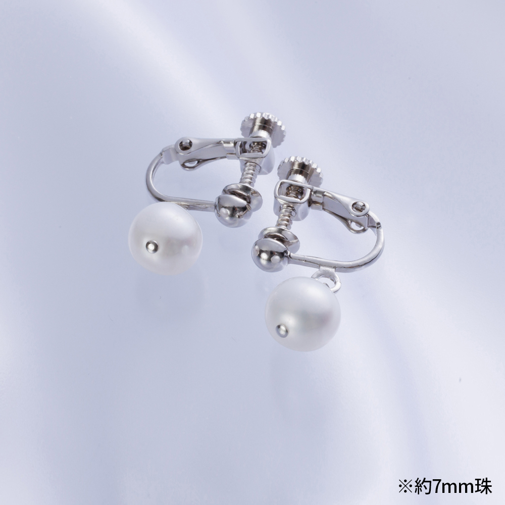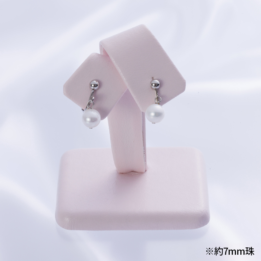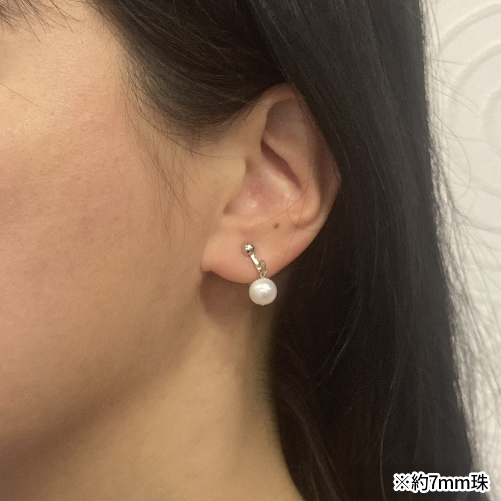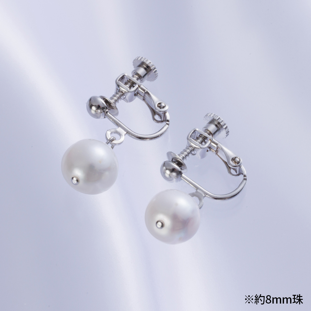 湖水真珠:約7mm珠または約8mm珠 イヤリング:真鍮(銀色メッキ)・ネジバネ式、両穴スイングタイプ ピアス:チタン・シリコンキャッチ式、両穴スイングタイプ |