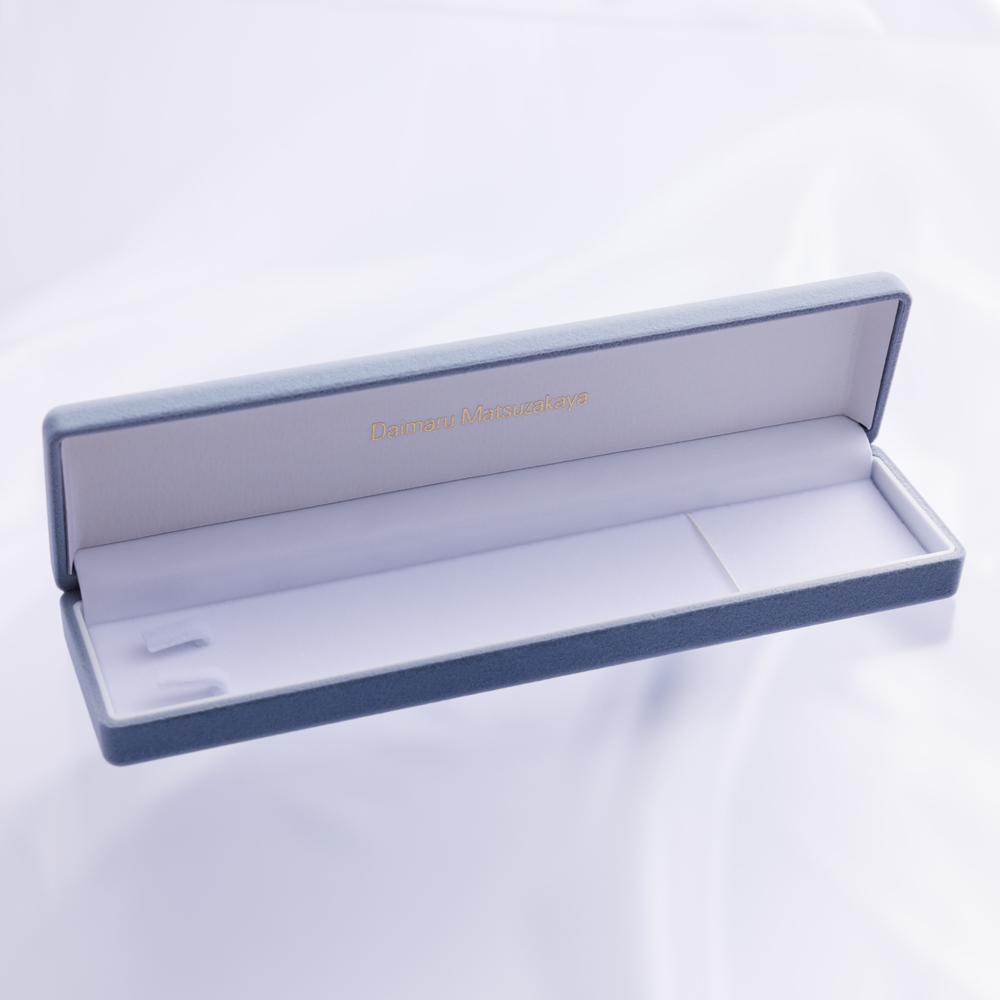 大切なジュエリーを長く美しく保つために、上品なべっちん風素材を使用した、大丸松坂屋のネーム入り専用ケースにお入れしてお届けします。ケースは、さらに外箱(紙箱)に入れて梱包。高級感と安心感のある仕様で、ギフトにもぴったりです。