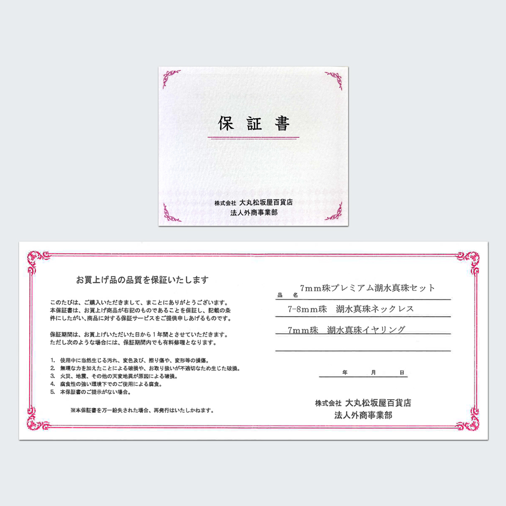 ご購入いただいた商品には、大丸松坂屋法人外商事業部が発行する保証書を同封いたします。この保証書は、商品の品質を正式に保証するものです。
