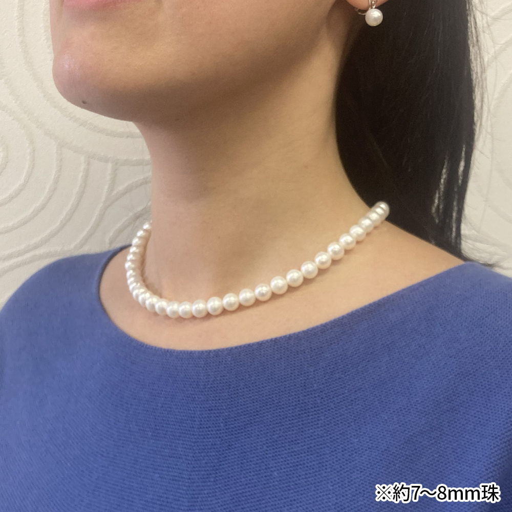 7〜8mm珠の湖水真珠は、セミラウンドとは思えない美しい粒立ちと深い照り。約42cmのプリンセスサイズで、首元を上品に演出します。イヤリングは揺れる両穴タイプ。ピアスもお選びいただけます。
