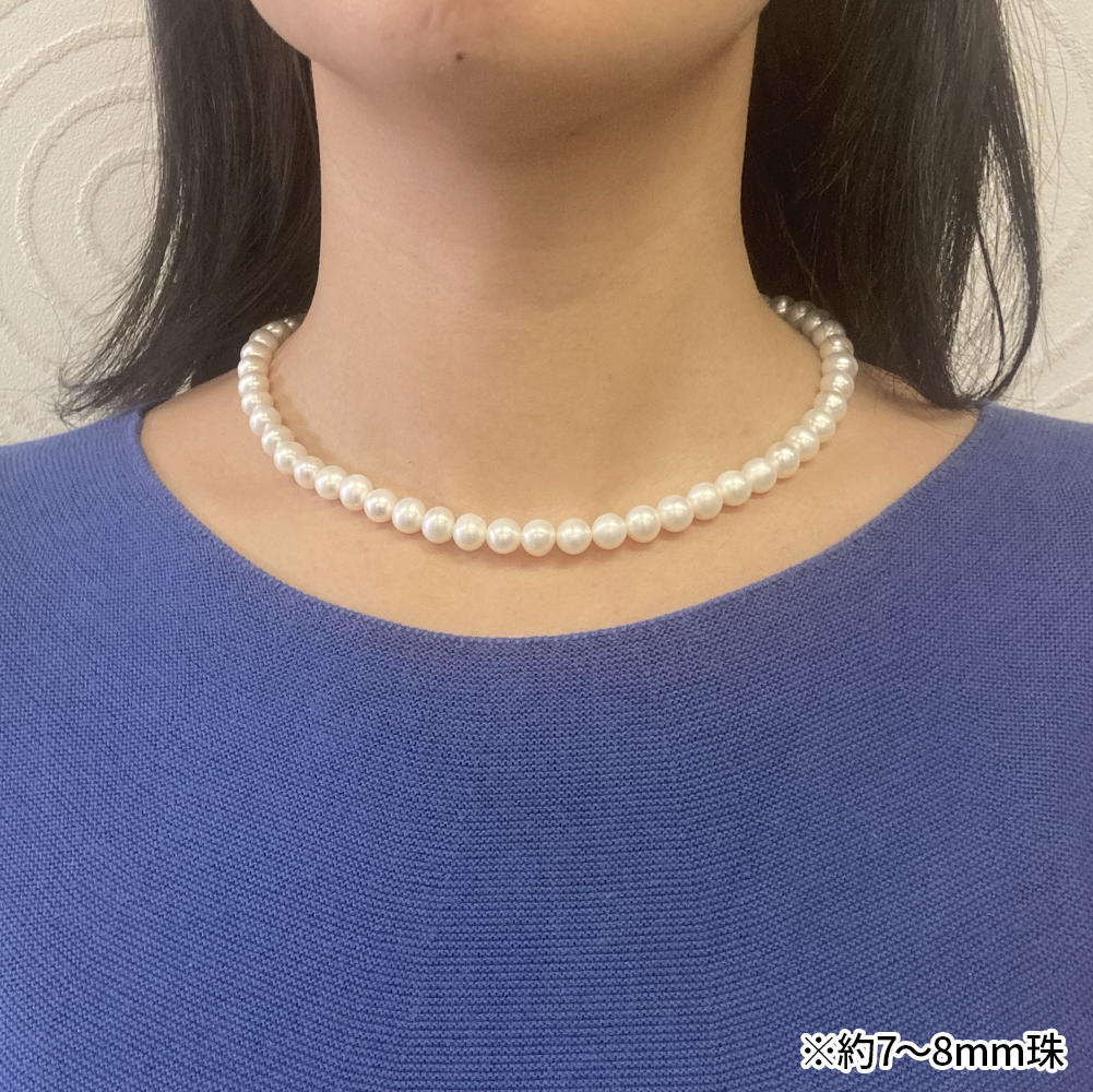 7〜8mm珠(または8〜9mm珠)湖水真珠ネックレスは、セミラウンドとは思えない粒立てで、深い重厚感があり優雅に輝きます。