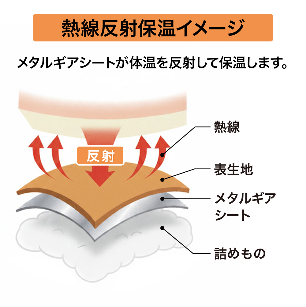 肌に近い位置に東洋紡せんい株式会社の「メタルギアシート」(保温性に優れたアルミシート)を使用し、身体から出る熱を反射し効率よく温めます。